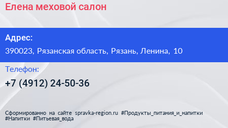 Елена, меховой салон по адресу 390023, Рязанская область, Рязань, Ленина, 10 в дальнейшем Организация, размещена в следующих категориях: