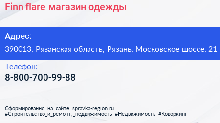 Finn flare, магазин одежды по адресу 390013, Рязанская область, Рязань, Московское шоссе, 21 в дальнейшем Организация, размещена в следующих категориях: