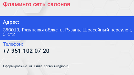 Фламинго, сеть салонов по адресу 390013, Рязанская область, Рязань, Шоссейный переулок, 5 ст2 в дальнейшем Организация, размещена в следующих категориях: