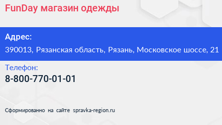 FunDay, магазин одежды по адресу 390013, Рязанская область, Рязань, Московское шоссе, 21 в дальнейшем Организация, размещена в следующих категориях: