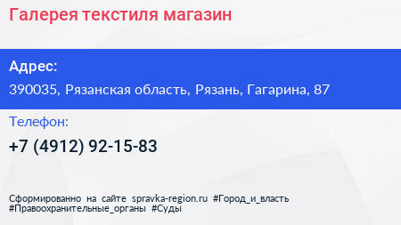 Галерея текстиля, магазин по адресу 390035, Рязанская область, Рязань, Гагарина, 87 в дальнейшем Организация, размещена в следующих категориях: