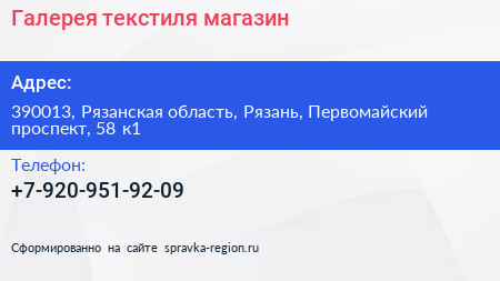 Галерея текстиля, магазин по адресу 390013, Рязанская область, Рязань, Первомайский проспект, 58 к1 в дальнейшем Организация, размещена в следующих категориях: