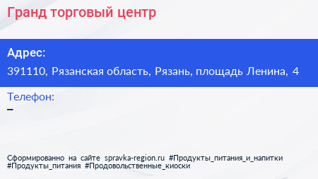 Гранд, торговый центр по адресу 391110, Рязанская область, Рязань, площадь Ленина, 4 в дальнейшем Организация, размещена в следующих категориях: