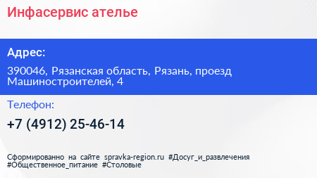 Инфасервис, ателье по адресу 390046, Рязанская область, Рязань, проезд Машиностроителей, 4 в дальнейшем Организация, размещена в следующих категориях: