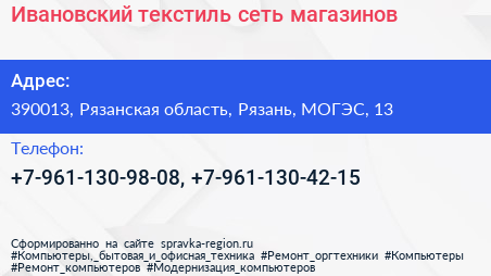 Ивановский текстиль, сеть магазинов по адресу 390013, Рязанская область, Рязань, МОГЭС, 13 в дальнейшем Организация, размещена в следующих категориях:
