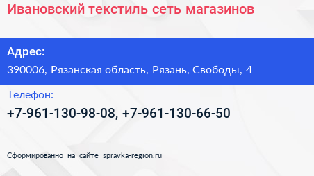 Ивановский текстиль, сеть магазинов по адресу 390006, Рязанская область, Рязань, Свободы, 4 в дальнейшем Организация, размещена в следующих категориях: