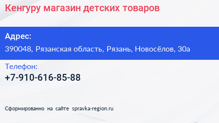 Кенгуру, магазин детских товаров по адресу 390048, Рязанская область, Рязань, Новосёлов, 30а в дальнейшем Организация, размещена в следующих категориях: