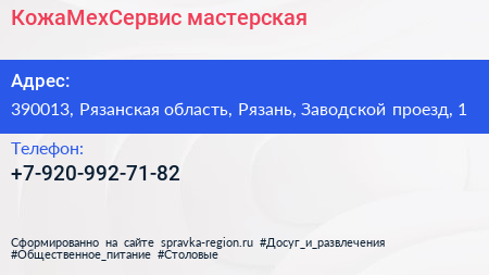 КожаМехСервис, мастерская по адресу 390013, Рязанская область, Рязань, Заводской проезд, 1 в дальнейшем Организация, размещена в следующих категориях: