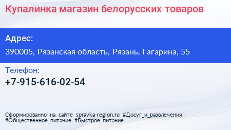 Купалинка, магазин белорусских товаров по адресу 390005, Рязанская область, Рязань, Гагарина, 55 в дальнейшем Организация, размещена в следующих категориях: