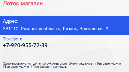 Лотос, магазин по адресу 391110, Рязанская область, Рязань, Вокзальная, 3 в дальнейшем Организация, размещена в следующих категориях:
