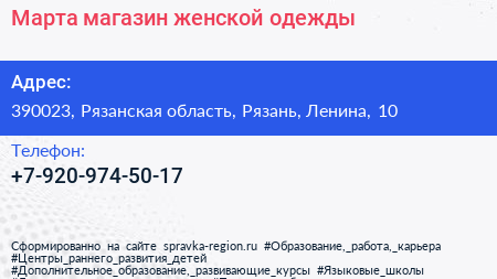 Марта, магазин женской одежды по адресу 390023, Рязанская область, Рязань, Ленина, 10 в дальнейшем Организация, размещена в следующих категориях: