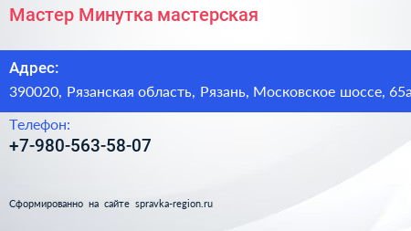 Мастер Минутка, мастерская по адресу 390020, Рязанская область, Рязань, Московское шоссе, 65а в дальнейшем Организация, размещена в следующих категориях: