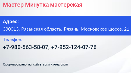 Мастер Минутка, мастерская по адресу 390013, Рязанская область, Рязань, Московское шоссе, 21 в дальнейшем Организация, размещена в следующих категориях: