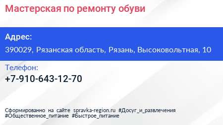 Мастерская по ремонту обуви по адресу 390029, Рязанская область, Рязань, Высоковольтная, 10 в дальнейшем Организация, размещена в следующих категориях: