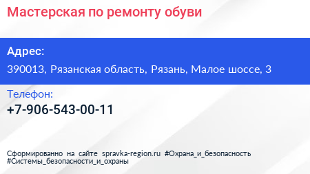 Мастерская по ремонту обуви по адресу 390013, Рязанская область, Рязань, Малое шоссе, 3 в дальнейшем Организация, размещена в следующих категориях: