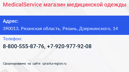 MedicalService, магазин медицинской одежды по адресу 390013, Рязанская область, Рязань, Дзержинского, 14 в дальнейшем Организация, размещена в следующих категориях: