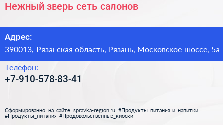 Нежный зверь, сеть салонов по адресу 390013, Рязанская область, Рязань, Московское шоссе, 5а в дальнейшем Организация, размещена в следующих категориях: