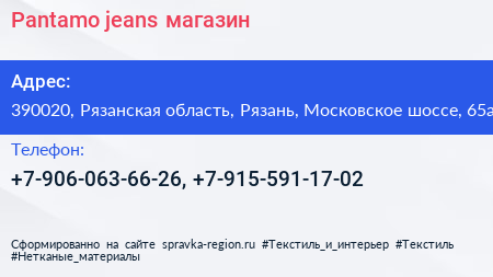 Pantamo jeans, магазин по адресу 390020, Рязанская область, Рязань, Московское шоссе, 65а в дальнейшем Организация, размещена в следующих категориях: