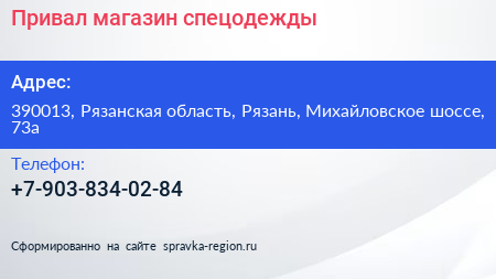 Привал, магазин спецодежды по адресу 390013, Рязанская область, Рязань, Михайловское шоссе, 73а в дальнейшем Организация, размещена в следующих категориях: