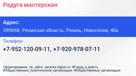 Радуга, мастерская по адресу 390048, Рязанская область, Рязань, Новосёлов, 40а в дальнейшем Организация, размещена в следующих категориях: