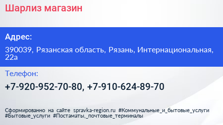 Шарлиз, магазин по адресу 390039, Рязанская область, Рязань, Интернациональная, 22а в дальнейшем Организация, размещена в следующих категориях: