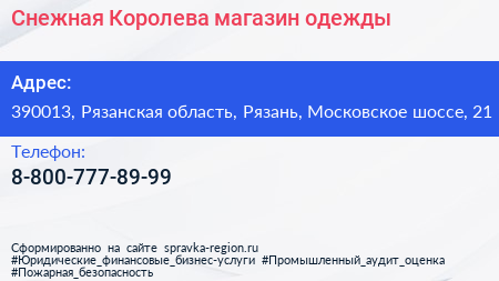 Снежная Королева, магазин одежды по адресу 390013, Рязанская область, Рязань, Московское шоссе, 21 в дальнейшем Организация, размещена в следующих категориях: