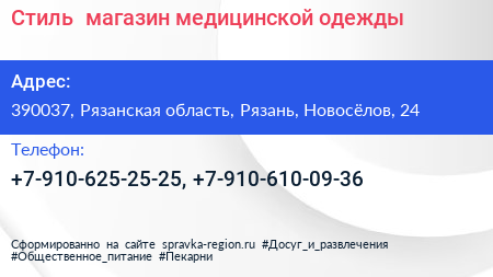 Стиль+, магазин медицинской одежды по адресу 390037, Рязанская область, Рязань, Новосёлов, 24 в дальнейшем Организация, размещена в следующих категориях: