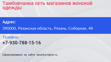 Тамбовчанка, сеть магазинов женской одежды по адресу 390000, Рязанская область, Рязань, Соборная, 48 в дальнейшем Организация, размещена в следующих категориях: