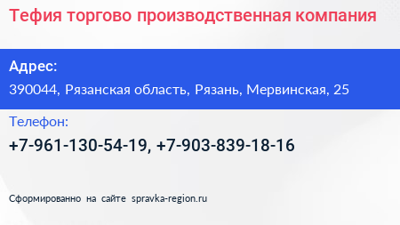 Тефия, торгово-производственная компания по адресу 390044, Рязанская область, Рязань, Мервинская, 25 в дальнейшем Организация, размещена в следующих категориях:
