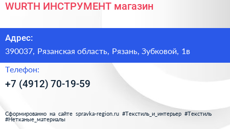 WURTH ИНСТРУМЕНТ, магазин по адресу 390037, Рязанская область, Рязань, Зубковой, 1в в дальнейшем Организация, размещена в следующих категориях: