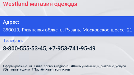 Westland, магазин одежды по адресу 390013, Рязанская область, Рязань, Московское шоссе, 21 в дальнейшем Организация, размещена в следующих категориях: