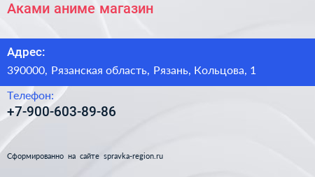 Аками, аниме-магазин по адресу 390000, Рязанская область, Рязань, Кольцова, 1 в дальнейшем Организация, размещена в следующих категориях: