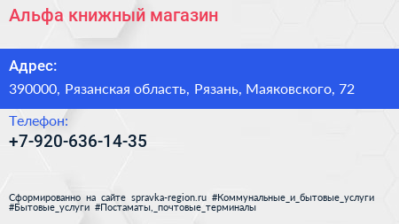 Альфа, книжный магазин по адресу 390000, Рязанская область, Рязань, Маяковского, 72 в дальнейшем Организация, размещена в следующих категориях:
