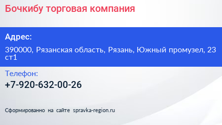 Бочкибу, торговая компания по адресу 390000, Рязанская область, Рязань, Южный промузел, 23 ст1 в дальнейшем Организация, размещена в следующих категориях: