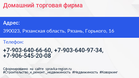 Домашний, торговая фирма по адресу 390023, Рязанская область, Рязань, Горького, 16 в дальнейшем Организация, размещена в следующих категориях: