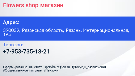 Flowers shop, магазин по адресу 390039, Рязанская область, Рязань, Интернациональная, 16а в дальнейшем Организация, размещена в следующих категориях: