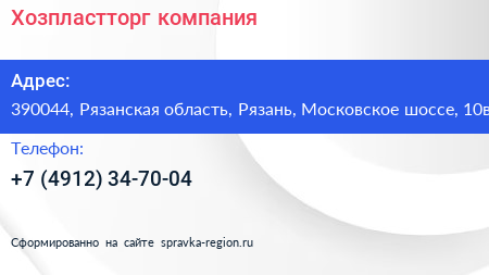 Хозпластторг, компания по адресу 390044, Рязанская область, Рязань, Московское шоссе, 10в в дальнейшем Организация, размещена в следующих категориях: