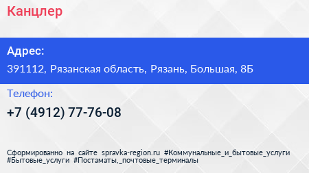 Канцлер по адресу 391112, Рязанская область, Рязань, Большая, 8Б в дальнейшем Организация, размещена в следующих категориях: