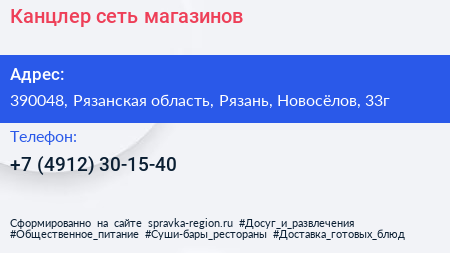 Канцлер, сеть магазинов по адресу 390048, Рязанская область, Рязань, Новосёлов, 33г в дальнейшем Организация, размещена в следующих категориях: