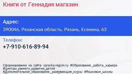 Книги от Геннадия, магазин по адресу 390046, Рязанская область, Рязань, Есенина, 63 в дальнейшем Организация, размещена в следующих категориях: