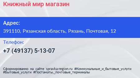 Книжный мир, магазин по адресу 391110, Рязанская область, Рязань, Почтовая, 12 в дальнейшем Организация, размещена в следующих категориях: