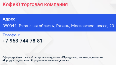 КофеЮ, торговая компания по адресу 390044, Рязанская область, Рязань, Московское шоссе, 20 в дальнейшем Организация, размещена в следующих категориях: