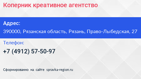 Коперник, креативное агентство по адресу 390000, Рязанская область, Рязань, Право-Лыбедская, 27 в дальнейшем Организация, размещена в следующих категориях: