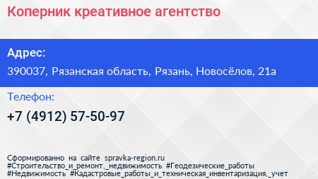 Коперник, креативное агентство по адресу 390037, Рязанская область, Рязань, Новосёлов, 21а в дальнейшем Организация, размещена в следующих категориях: