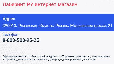 Лабиринт.РУ, интернет-магазин по адресу 390013, Рязанская область, Рязань, Московское шоссе, 21 в дальнейшем Организация, размещена в следующих категориях: