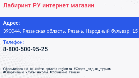 Лабиринт.РУ, интернет-магазин по адресу 390044, Рязанская область, Рязань, Народный бульвар, 15 в дальнейшем Организация, размещена в следующих категориях: