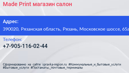 Made Print, магазин-салон по адресу 390020, Рязанская область, Рязань, Московское шоссе, 65а в дальнейшем Организация, размещена в следующих категориях: