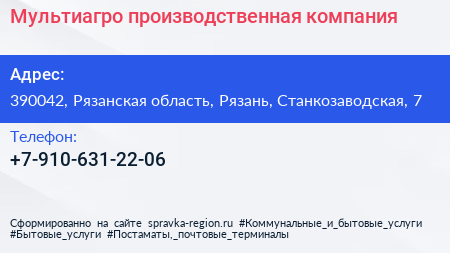 Мультиагро, производственная компания по адресу 390042, Рязанская область, Рязань, Станкозаводская, 7 в дальнейшем Организация, размещена в следующих категориях: