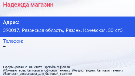 Надежда, магазин по адресу 390017, Рязанская область, Рязань, Качевская, 30 ст5 в дальнейшем Организация, размещена в следующих категориях: