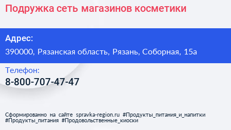 Подружка, сеть магазинов косметики по адресу 390000, Рязанская область, Рязань, Соборная, 15а в дальнейшем Организация, размещена в следующих категориях: